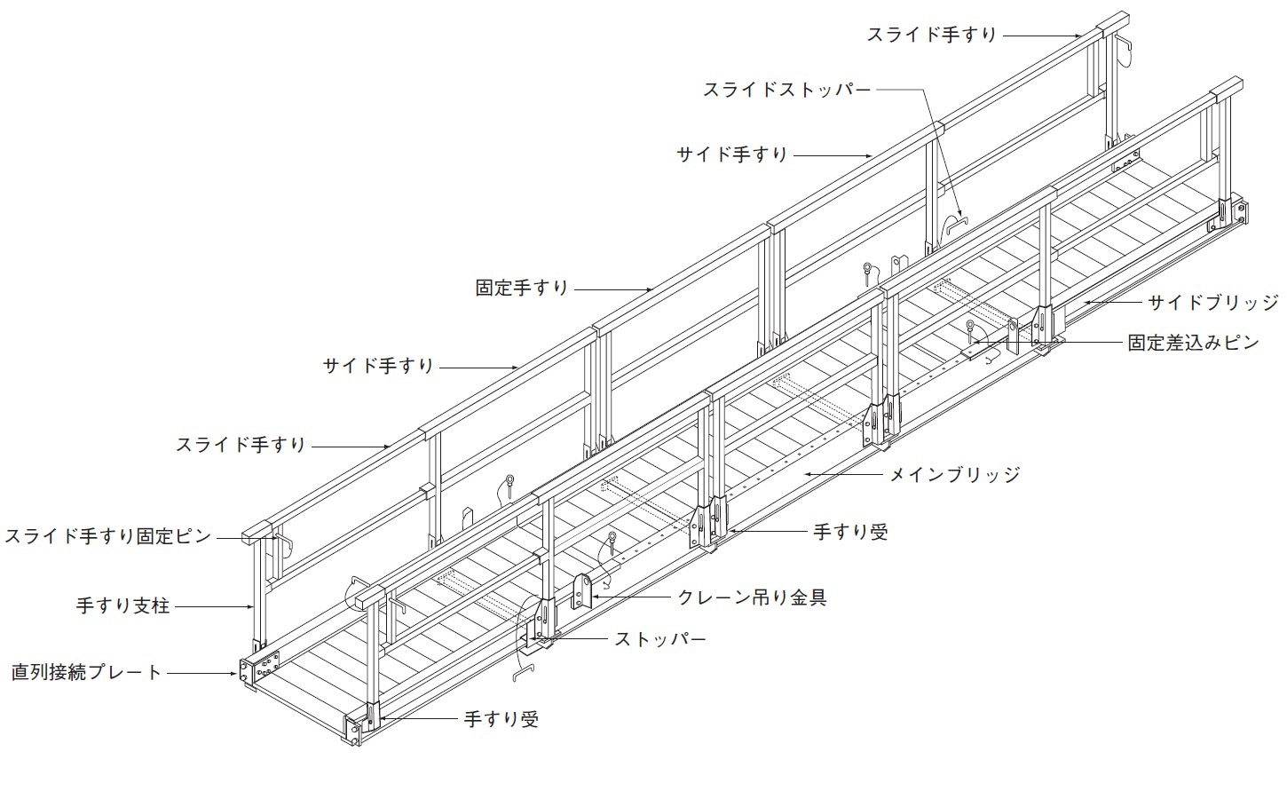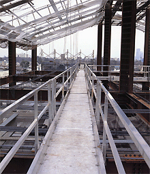 - ◆ 架設・解体が容易であり、短時間で安全通路を設置できるため、高所作業の安全性を確保し、作業能率の向上を促進します。また、SRC造用固定金具を使用すると、スカイブレッジを架設したままで配筋・コンクリート打設が行なえます。