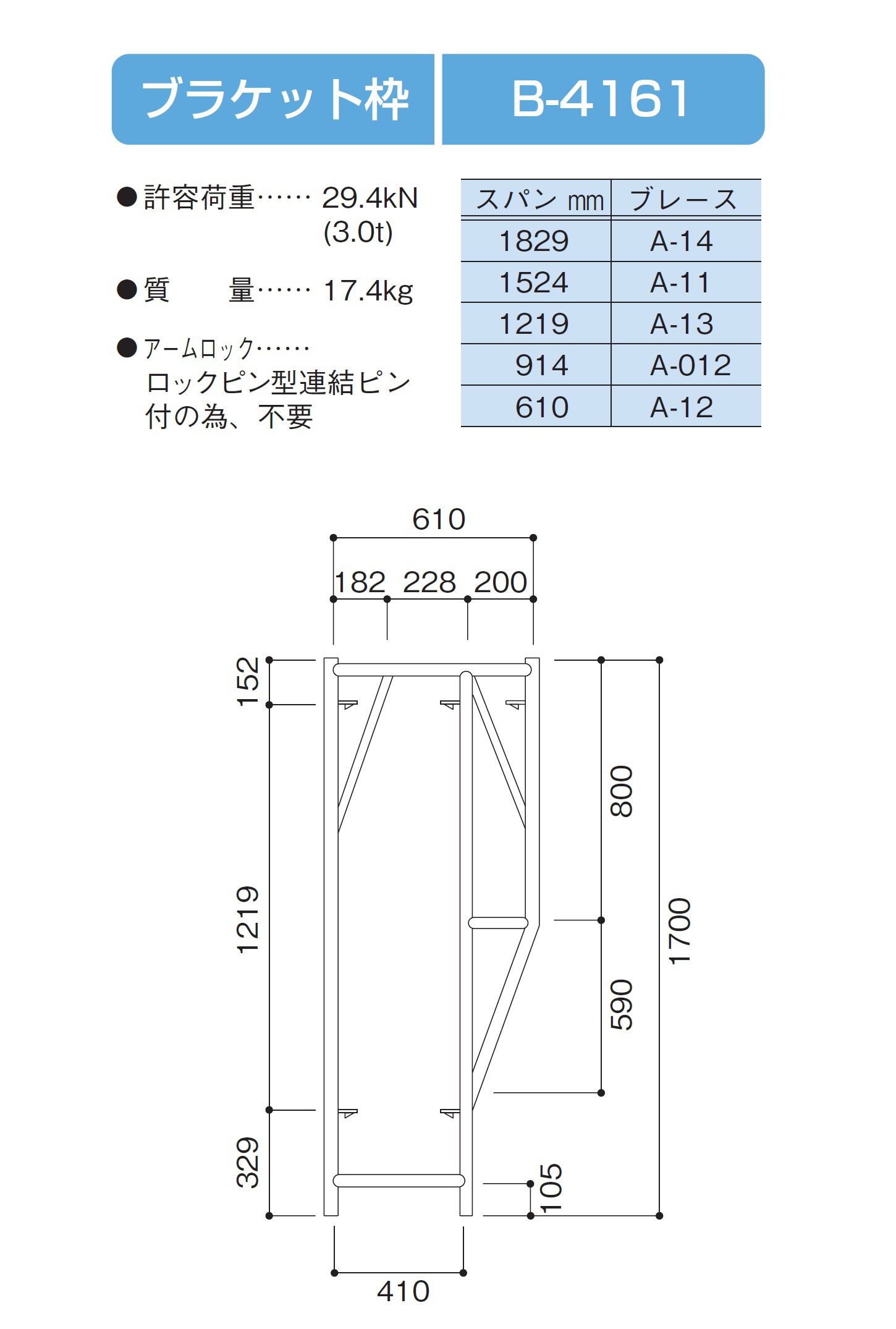 ・ブラケット枠を使用の場合は、足場に偏心荷重がかかるので、全スパンにわたりブラケット枠の上下に壁つなぎを取付けて下さい。