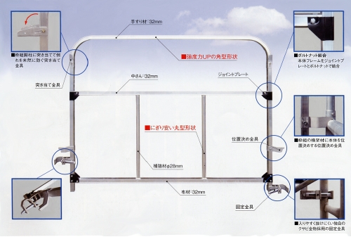 3. 先行手すり枠の下部固定金具を枠組の脚柱にセットします。