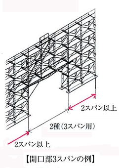 ・梁枠を用いた開口部の寸法は巾4スパン高さ3層以下として下さい。開口部分から外側は下記の必要スパンを確保して下さい。