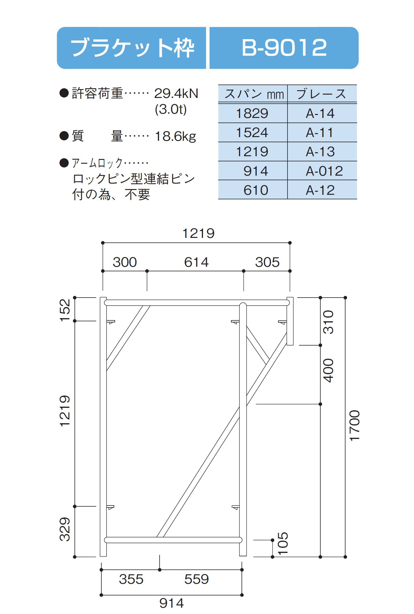 ・ブラケット枠を使用の場合は、足場に偏心荷重がかかるので、全スパンにわたりブラケット枠の上下に壁つなぎを取付けて下さい。