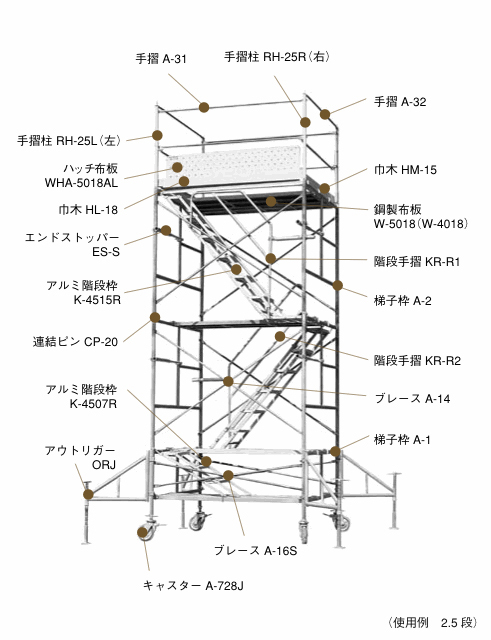 ■ 階段枠取付パイプKP-15は、キャスターA-728Jに差込みその上に梯子枠Aー2を設置して下さい。
