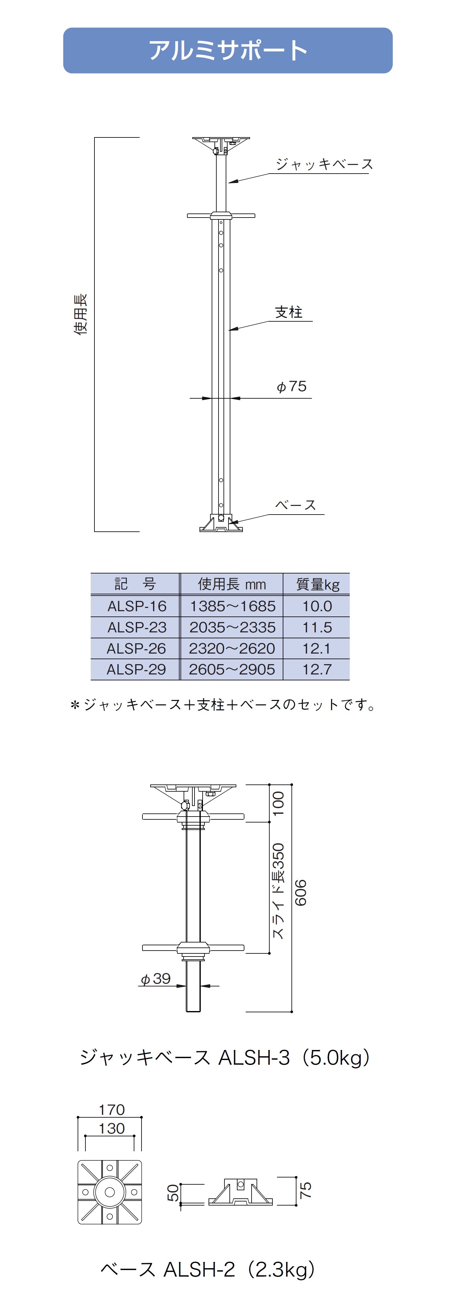- ◆ アルミビームは100角パイプの2倍以上の強度があります。 (使用長3.8m以上は単管パイプにて直角2方向に水平つなぎをお取り下さい)