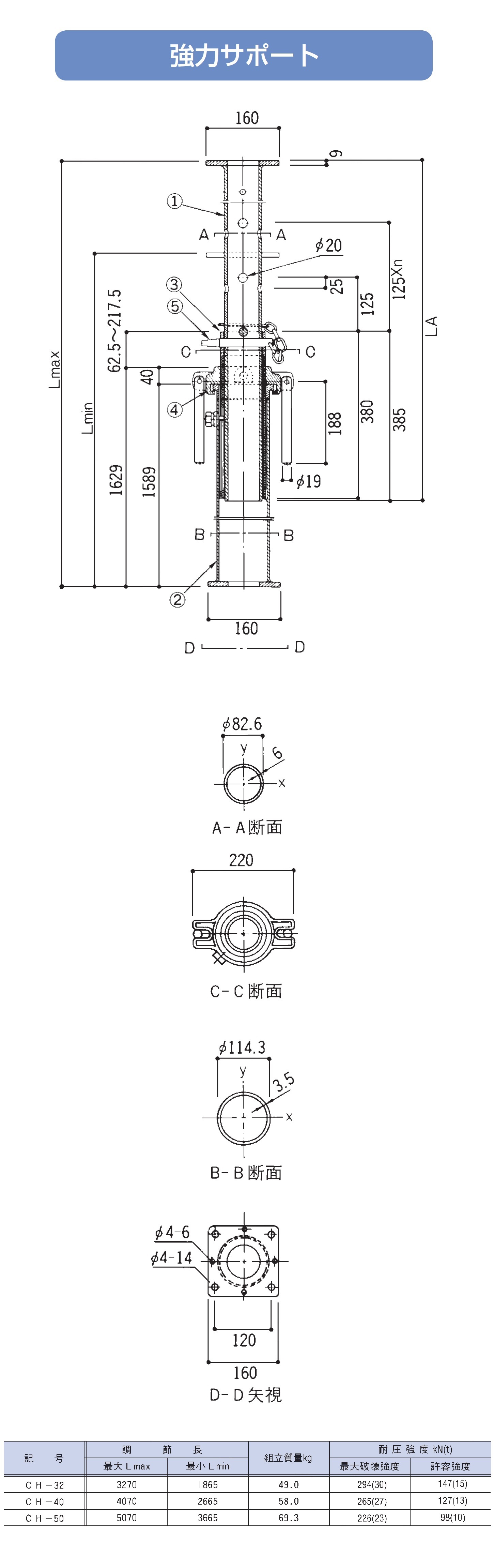 (1)許容荷重は両端平押しの場合ですから、使用時には根がらみ、首がらみを設けて下さい。
