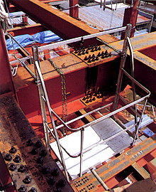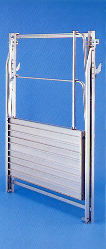 - ◆ 強度は十分、安全な構造 積載荷重は1、961N(200kg)です。斜材の下端部にはステップおよびピンによる二重安全装置を設け、安全には十分な配慮をしています。