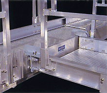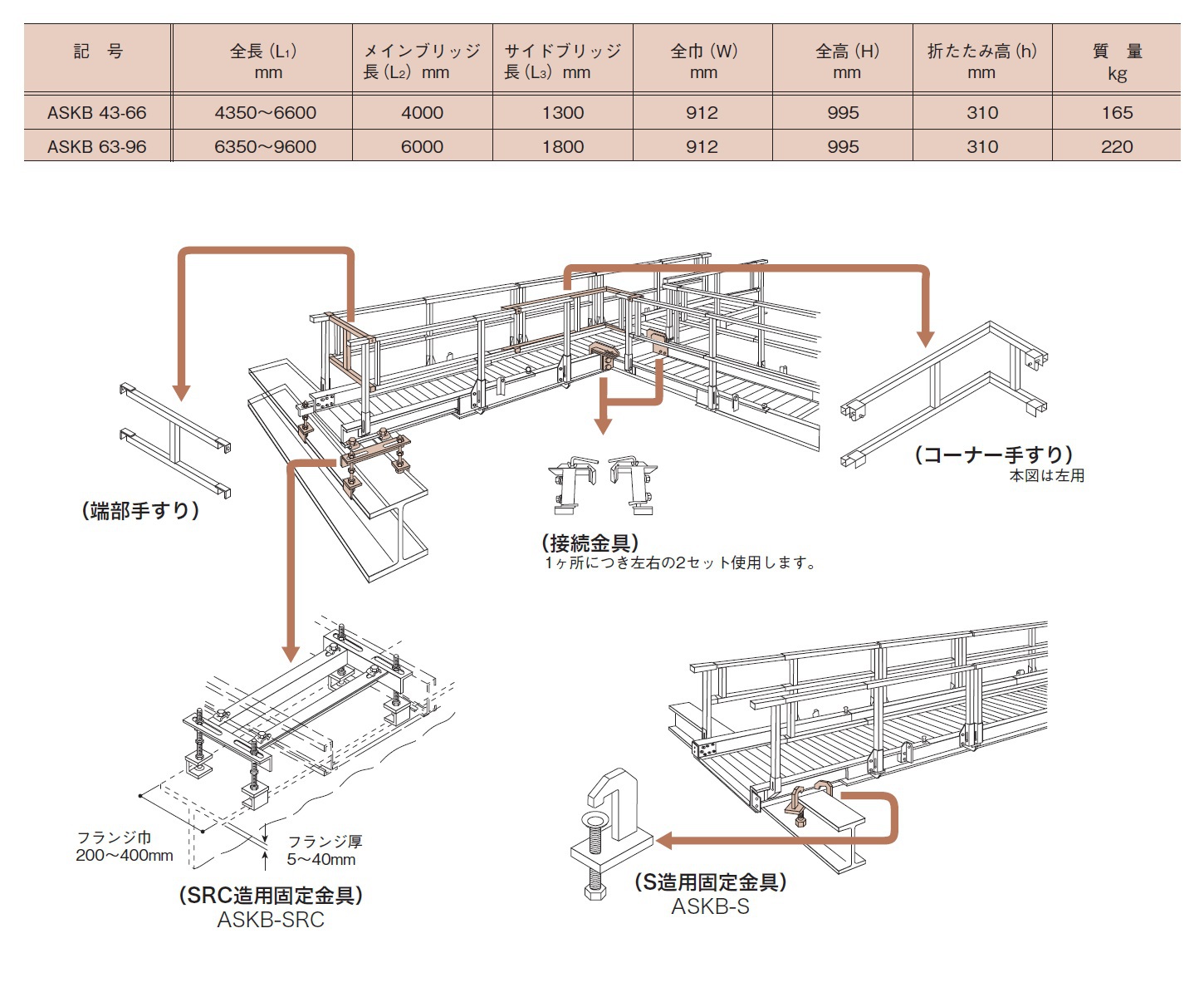 - ◆ 架設・解体が容易であり、短時間で安全通路を設置できるため、高所作業の安全性を確保し、作業能率の向上を促進します。また、SRC造用固定金具を使用すると、スカイブレッジを架設したままで配筋・コンクリート打設が行なえます。
