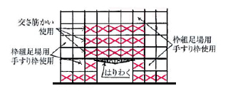 ・梁枠と梁枠で構成される水平構面には、梁渡し・鋼製布板等で水平構を構成し、全面に落下養生を兼ねた作業床を設けて下さい。