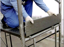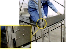 1. フラットな面を外側にして左側の固定金具を建枠脚柱にかけます。